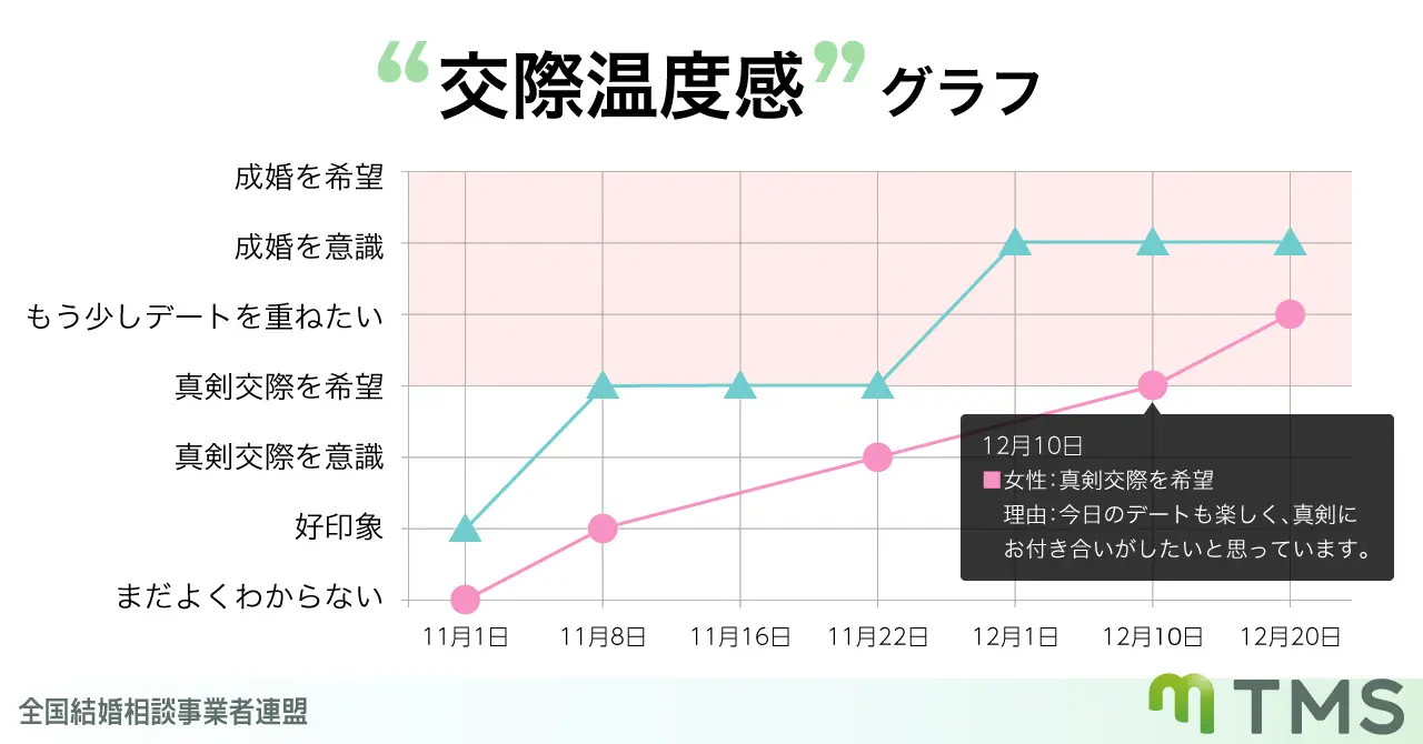 会員がなぜ前へ進めないのか、仲人による定性的なフィードバックと数字や交際温度感など可視化した定量的なデータを元に分析してくれるため、婚活におけるPDCAサイクルが回しやすいとされています。