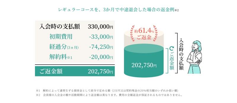 返金される費用は、入会時に支払った総費用から初期費用と経過分の月会費、解約料20,000円or契約残金の20%相当額のいずれか低い方を引いた金額が返金されます。